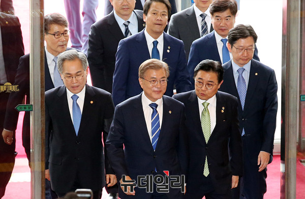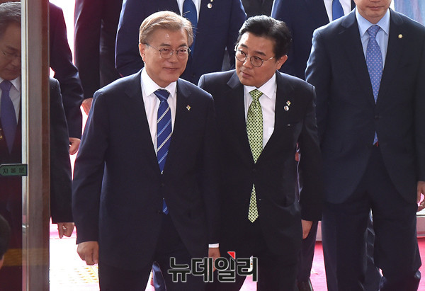 문재인 대통령이 12일 오후 서울 여의도 국회에서 일자리 추가경정예산안 시정연설을 위해 전병헌 정무수석과 대화를 하며 입장하고 있다.(사진=공동취재단)
