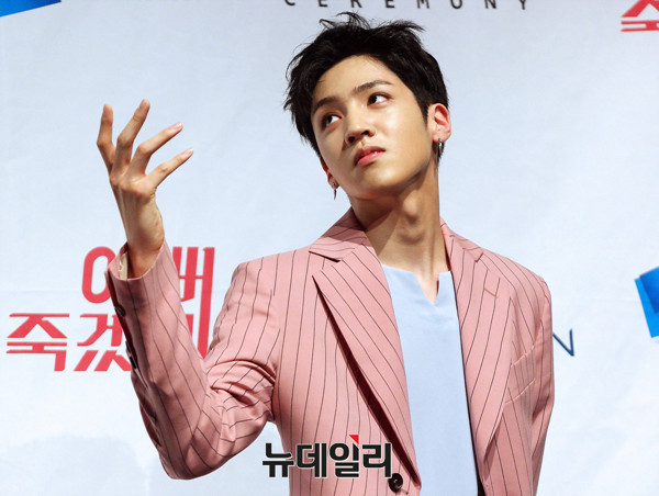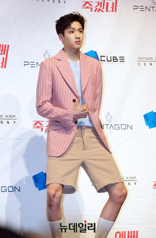 보이그룹 펜타곤의 우석이 12일 오후 서울 마포구 신한카드 판스퀘어 라이브홀에서 열린 펜타곤 세 번째 미니 앨범 '세리머니(CEREMONY)' 발매 기념 쇼케이스에 참석해 포토타임을 갖고 있다.