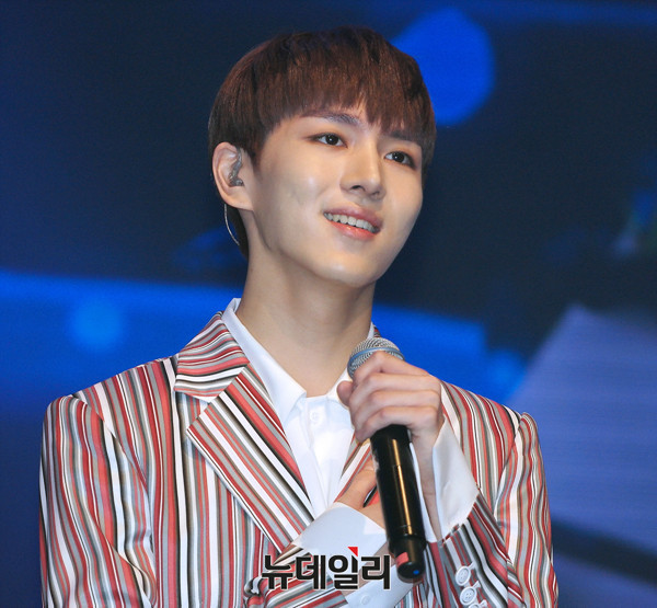 보이그룹 펜타곤의 키노가 12일 오후 서울 마포구 신한카드 판스퀘어 라이브홀에서 열린 펜타곤 세 번째 미니 앨범 '세리머니(CEREMONY)' 발매 기념 쇼케이스에 참석해 인사말을 하고 있다.