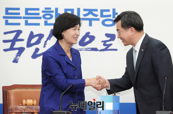 김동연 신임 부총리 겸 기획재정부장관이 12일 오후 국회 더불어민주당 대표회의실에서 추미애 대표를 예방해 악수를 나누고 있다. 김 부총리는 이어 우원식 원내대표를 예방했다.