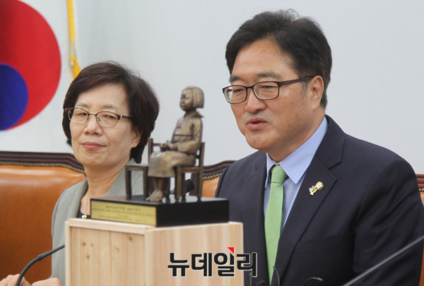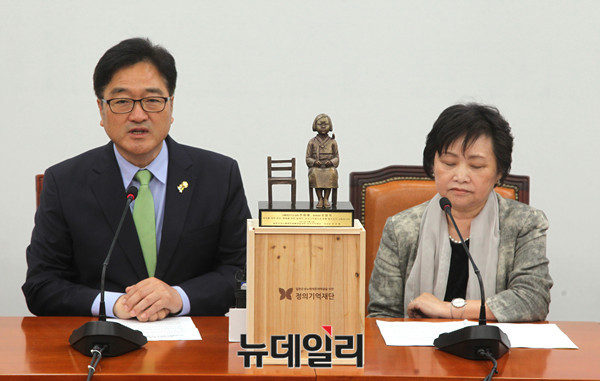 더불어민주당 우원식 원내대표가 13일 오전 국회에서 열린 일본군 성노예제 문제해결을 위한 정의기억재단과 20만동행인 캠페인 후원 감사패 및 2015 한일합의 관련 요구안 전달식에서 모두발언을 하고 있다.