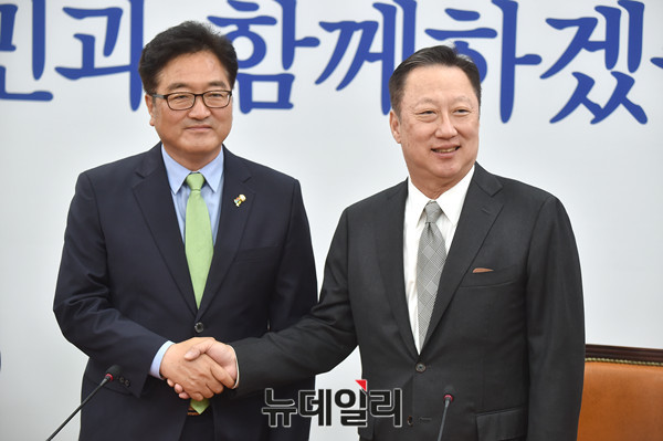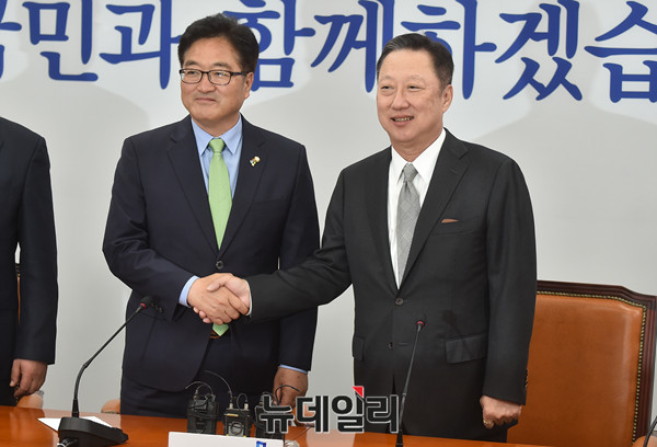 [포토] 악수 나누는 박용만 대한상의회 회장과 우원식 원내대표