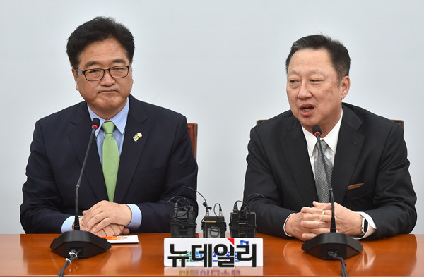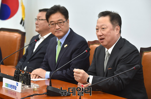박용만 대한상의 회장이 13일 오전 국회를 찾아 우원식 더불어민주당 원내대표를 만나 대화를 나누고 있다.