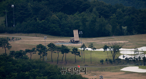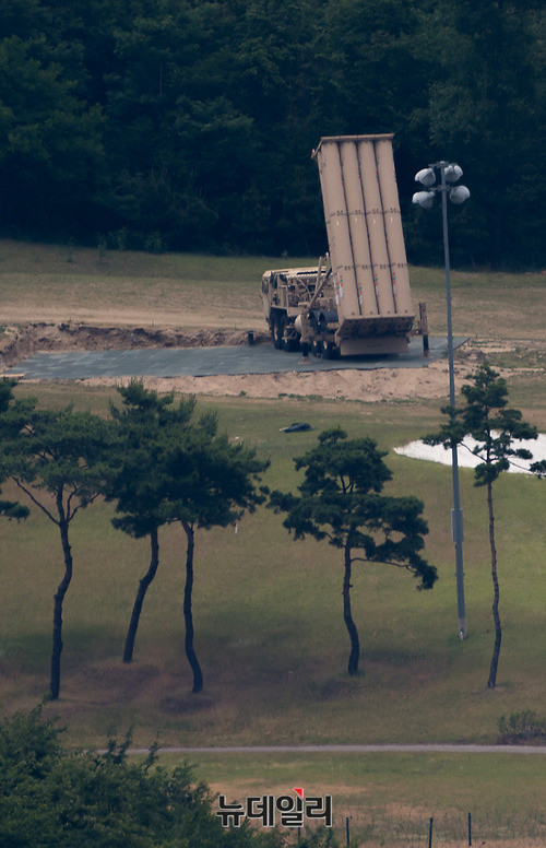 사드(THAAD·고고도미사일방어체계) 발사대가 13일 오후 경북 성주군 성주골프장에 배치 돼 있다. 이날 군은 지난 9일 강원도 인제의 한 야산에서 발견된 북한군 소형 무인기에 대한 초기 분석 결과 "사드를 촬영한 사진 10여 장이 발견됐다"고 밝혔다.