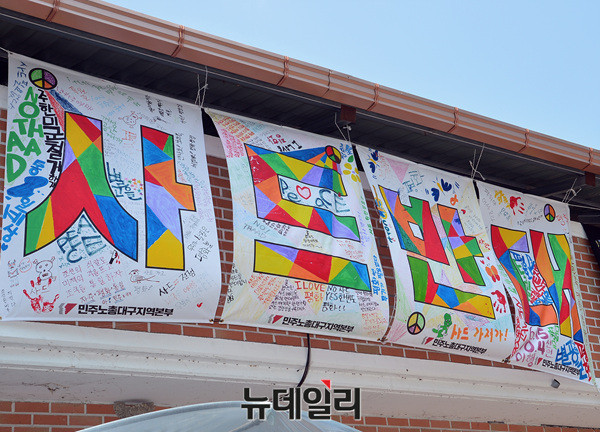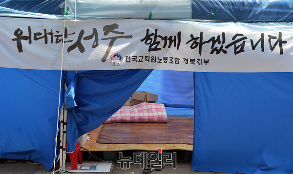 사드(THAAD·고고도미사일방어체계) 포대가 위치한 경상북도 성주골프장 앞 소성리 마을에 13일 오후 민노총(전국민주노동조합총연맹), 전교조(전국교직원노동조합)가 제작한 현수막이 걸려있다.