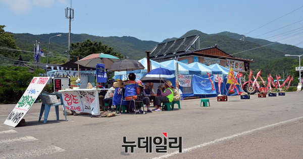 현재 소성리 마을 주민들이 성주골프장 입구 도로를 불법 무단 점거하여 유류 및 보급품 유입의 차질이 생기고 있다. (경북 성주=뉴데일리 공준표 기자)