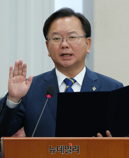 김부겸 행정자치부 장관 후보자가 14일 오전 국회에서 열린 인사청문회에 출석해 선서하고 있다.이날 오전 예정됐던 김 후보자 청문회는 한국당 의원들의 불참으로 정회됐지만 한국당의 참석 결정에 따라 오후 2시부터 재개됐다.