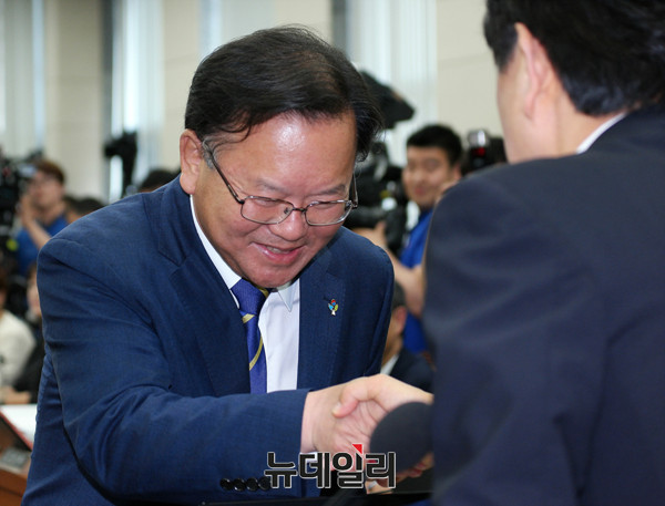 김부겸 행정자치부 장관 후보자가 14일 오전 국회에서 열린 인사청문회에 출석해 선서 직후 유재중 위원장과 악수하고 있다.