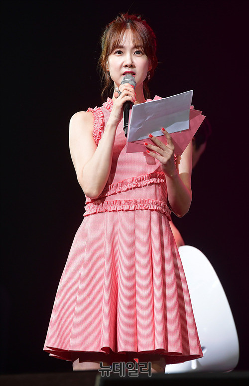 방송인 박소현이 14일 오후 서울 광진구 예스24 라이브홀에서 열린 NCT127(태일, 쟈니, 태용, 유타, 도영, 재현, 윈윈, 마크, 해찬) 세 번째 미니앨범 'NCT #127 CHERRRY BOMB(체리밤)' 쇼케이스에서 사회를 보고 있다.