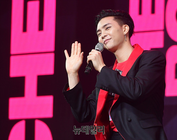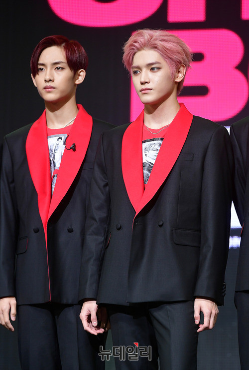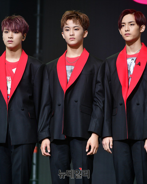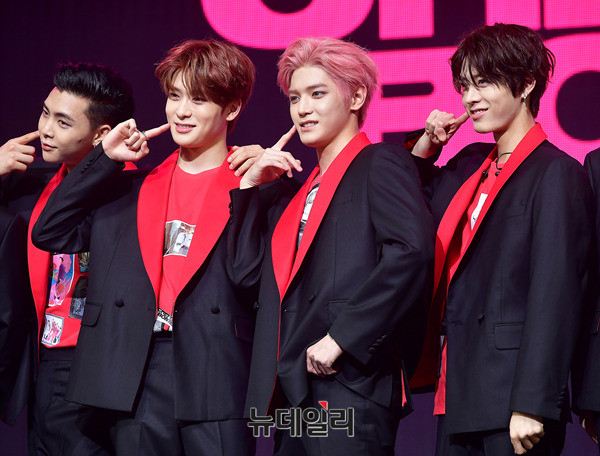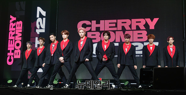 아이돌그룹 NCT127(태일, 쟈니, 태용, 유타, 도영, 재현, 윈윈, 마크, 해찬)이 14일 오후 서울 광진구 예스24 라이브홀에서 열린 세 번째 미니앨범 'NCT #127 CHERRRY BOMB(체리밤)' 쇼케이스에서 포토타임을 갖고 있다.