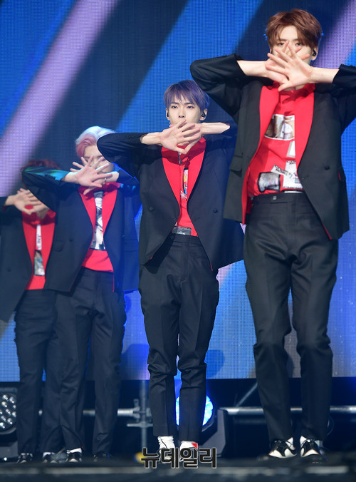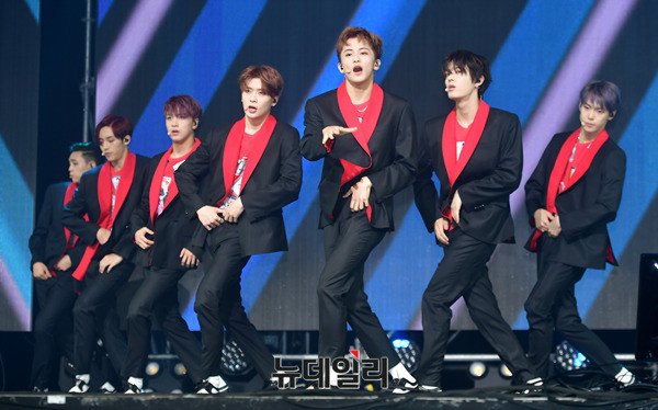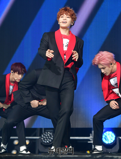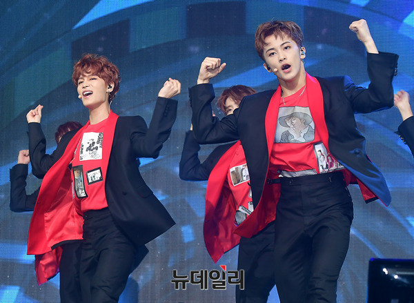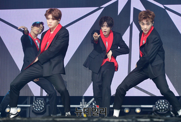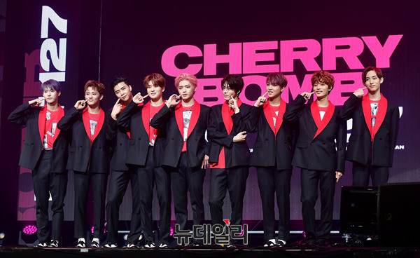 아이돌그룹 NCT127(태일, 쟈니, 태용, 유타, 도영, 재현, 윈윈, 마크, 해찬)이 14일 오후 서울 광진구 예스24 라이브홀에서 열린 세 번째 미니앨범 'NCT #127 CHERRRY BOMB(체리밤)' 쇼케이스에서 신곡 무대를 선보이고 있다.