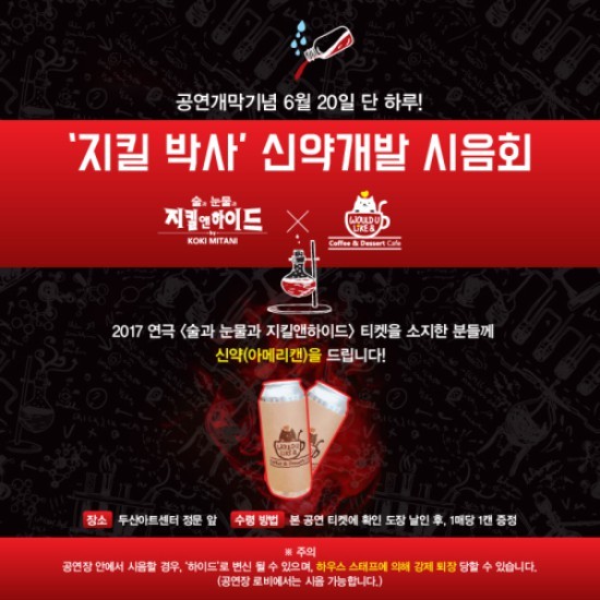 먼저 개막 당일 '지킬 박사 신약개발 시음회'라는 타이틀로 공연장을 찾은 관객 전원에게 더치커피 아메리캔을 무료 증정한다. 첫 공연을 찾아준 관객들에게 감사의 의미로 준비한 이번 이벤트는 공연 티켓을 보여주면 누구나 커피를 받을 수 있다.