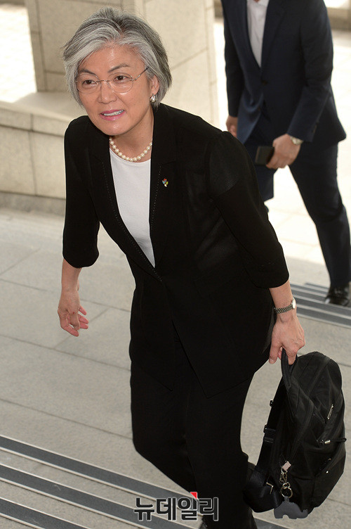 강경화 신임 외교부장관이 19일 오전 외교부에 취임식을 위해 들어서고 있다. 강 장관은 지난 18일 문재인 대통령에 의해 임명됐다.