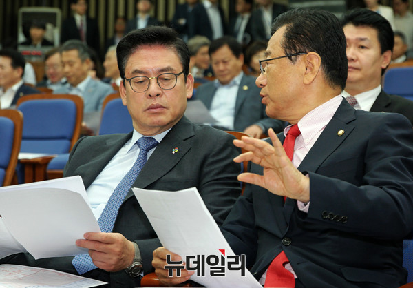 자유한국당 정우택 당대표 권한대행 겸 원내대표와 이현재 정책위의장이 19일 오전 국회에서 열린 의원총회에 참석해 대화를 나누고 있다.