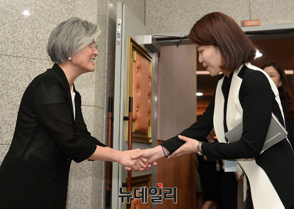 강경화 신임 외교부장관이 19일 오전 외교부에서 열린 취임식에 참석해 직원들과 악수를 나누고 있다. 강 장관은 지난 18일 문재인 대통령에 의해 임명됐다.