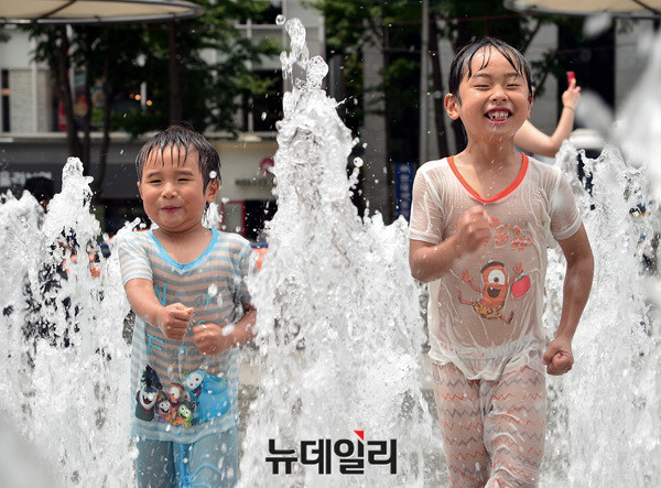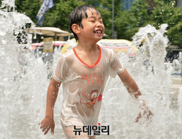 폭염특보가 내린 19일 오후 서울 광화문광장 분수대에서 아이들이 물놀이를 하고 있다. 이날 오전 5시를 기준으로 수도권과 호남·충청도·강원도 등 대부분 지역에 폭염주의보가 발효 중이다.