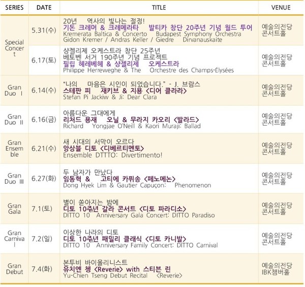 앙상블 디토의 역대 멤버를 중심으로 한 이번 페스티벌은 바이올리니스트 정경화, 피아니스트 임동혁, 첼리스트 고티에 카퓌송, 클래식 기타리스트 무라지 카오리, 뮤지컬 '헤드윅', '스프링 어웨이크닝' 등의 연출가 김민정까지 총출동한 최고의 무대를 준비하고 있다.
