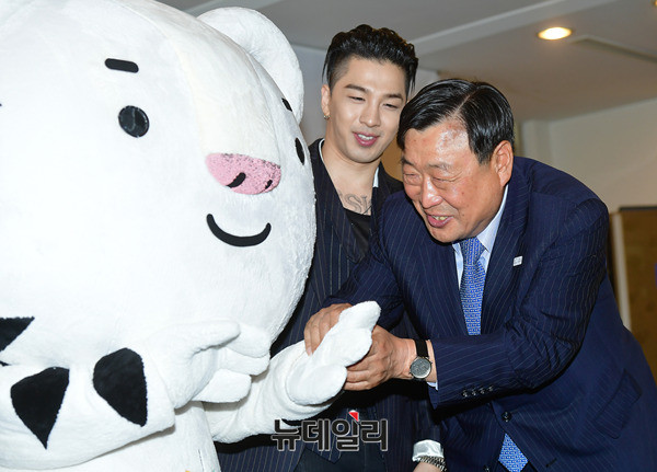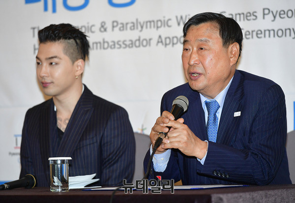 아이돌그룹 빅뱅의 태양과 이희범 조직위원장이 21일 오후 서울 중구 한국프레스센터에서 진행된 2018 평창 동계올림픽대회 및 동계패럴림픽대회 위촉식에 참석해 인사말을 하고 있다. 태양은 이번 위촉식으로 평창동계올림픽의 30번째 홍보대사가 됐다.