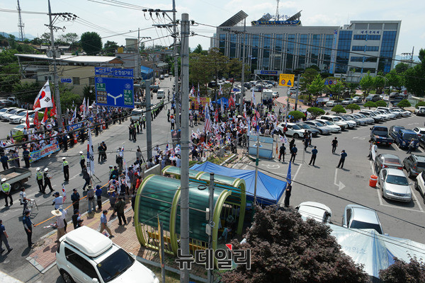 사드배치를 지지하는 애국단체가 22일 오후 2시부터 경북 성주군 성주군청 앞에서 대규모 집회를 열고 사드배치를 촉구하고 있다. 이들은 전국 각지에서 태극기와 성조기를 들고 모였다. 집회 직후 가두행진을 이어간 이들은 사드기지가 있는 소성리 마을회관 앞으로 이동해 집회를 이어 갈 예정이다. (경북 성주=뉴데일리 정상윤 기자)