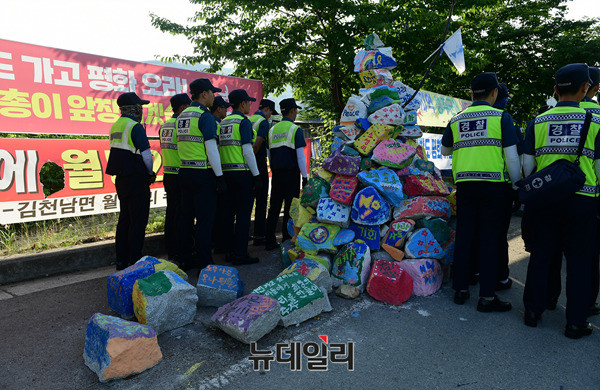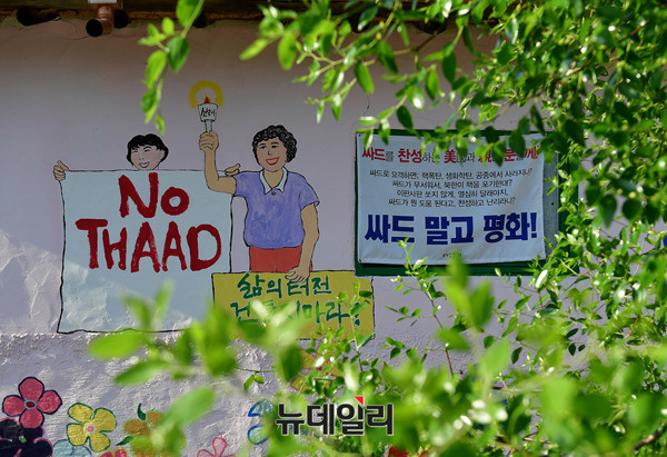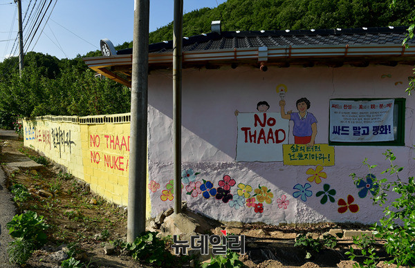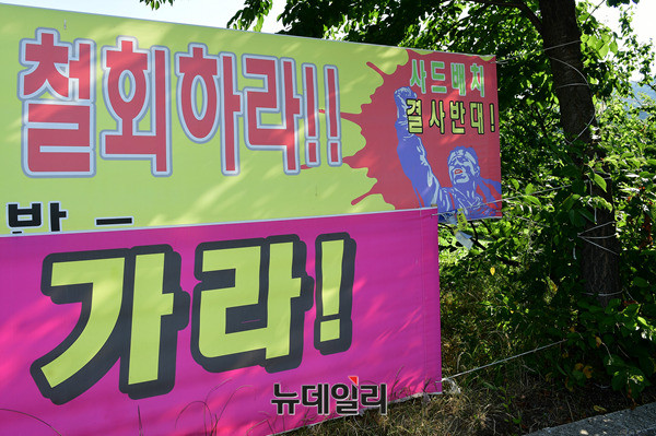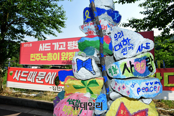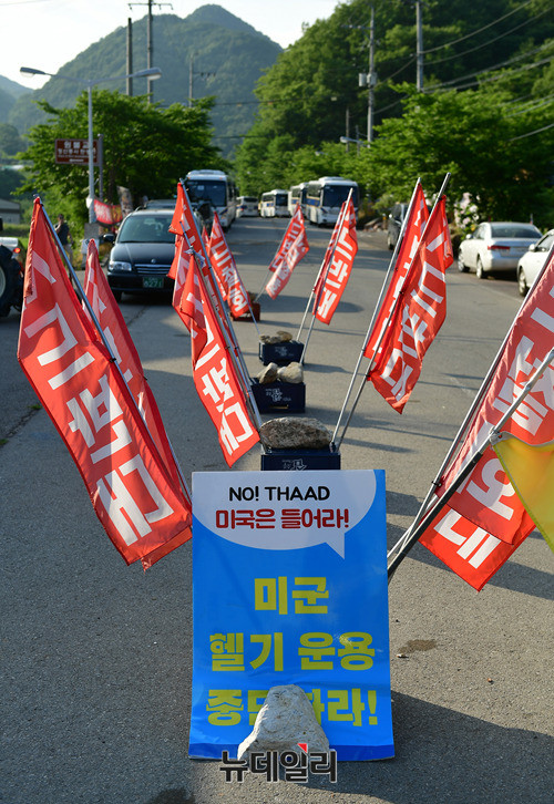22일 오후 사드포대 기지가 위치한 경북 성주군 소성리마을회관 앞에 설치된 사드배치 반대 현수막과 설치물. 소성리 마을로 들어서는 입구부터 "사드반대"를 새긴 깃발이 약 2Km 거리에 약 50m 간격으로 길 양 옆으로 설치 돼 있다. 또 사드배치를 반대하는 단체와 일부 주민들은 기지로 가는 입구를 봉쇄하고 차량을 통제하고 있다.