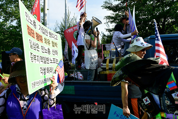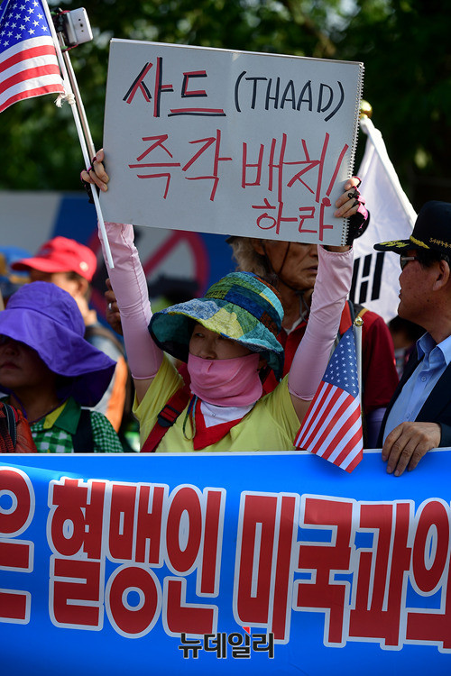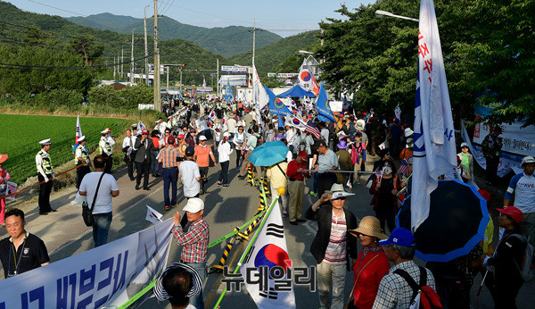 앞서 사드배치를 촉구하는 단체는 오후 2시부터 성주군청 앞에서 집회를 갖고, 가두행진을 이어갔다. (경북 성주=뉴데일리 정상윤 기자)