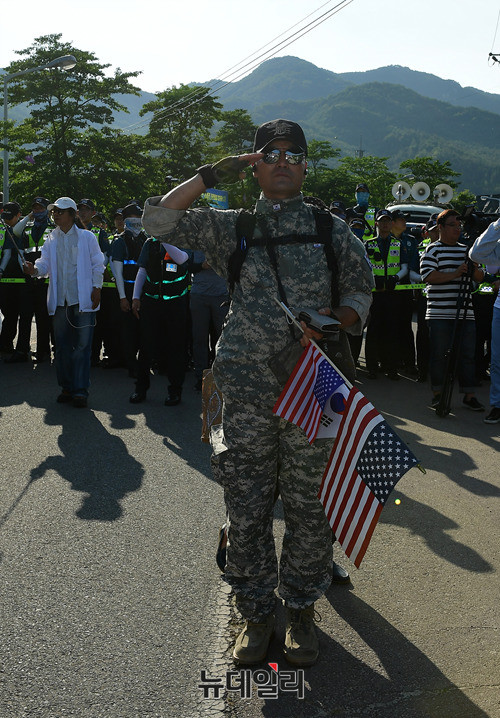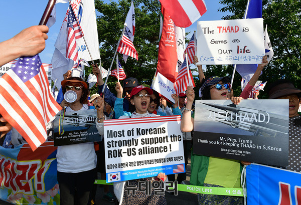 사드배치를 찬성하는 애국단체가 22일 오후 사드포대 기지 입구가 위치한 경북 성주군 소성리마을회관 앞에서 집회를 열고, 경찰과 대치하고 있다. 경찰은 마을회관에 있는 반대 단체와 충돌을 대비해 경찰벽으로 이동을 막았다. 이날 집회는 오후 6시께 큰 충돌없이 마무리됐다.
