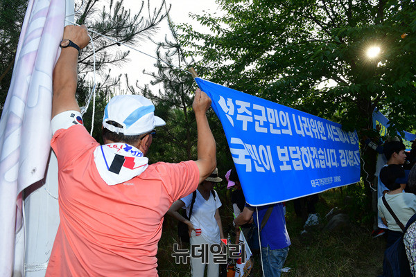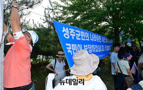사드배치를 찬성하는 애국단체가 22일 오후 사드포대 기지 입구가 위치한 경북 성주군 소성리마을회관 앞에서 집회 직후 집회에서 사용한 사드배치 촉구 현수막을 도로 가장자리에 설치하고 있다. 이들은 경찰에게 현수막을 잘 보호해 줄 것을 요구했다.
