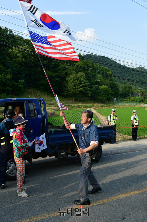 앞서 사드배치를 촉구하는 단체는 오후 2시부터 성주군청 앞에서 집회를 갖고, 가두행진을 이어갔다. (경북 성주=뉴데일리 정상윤 기자)