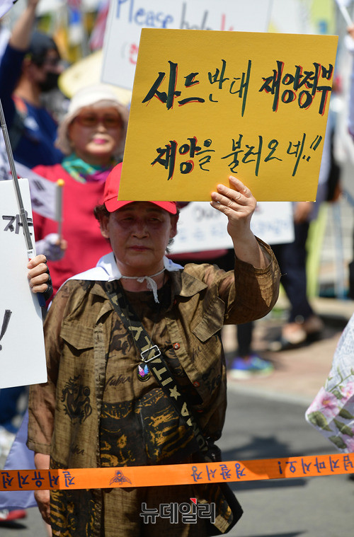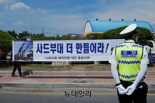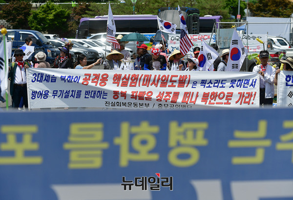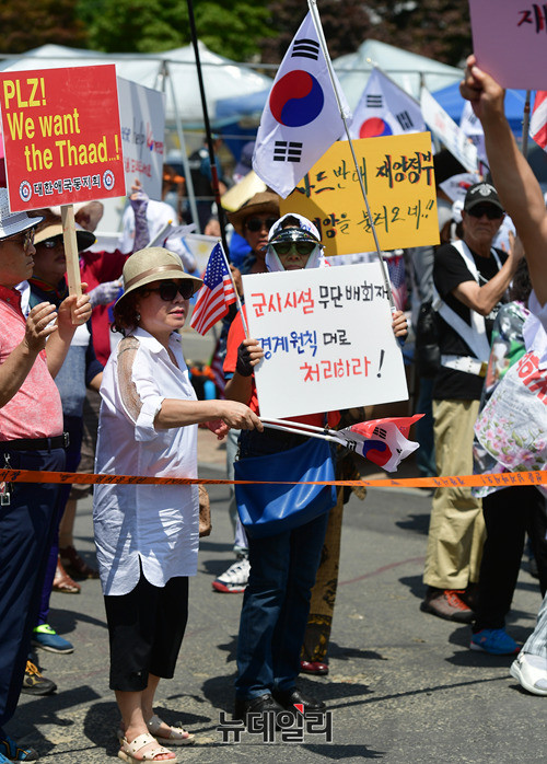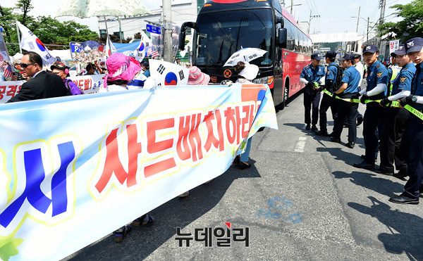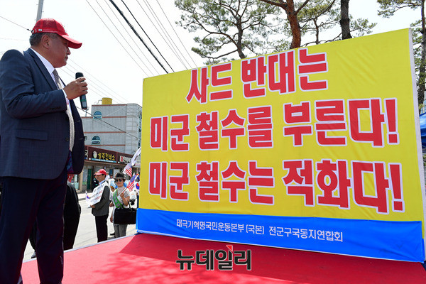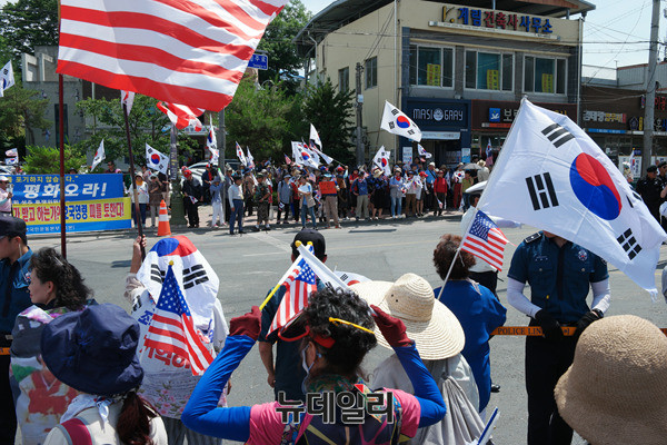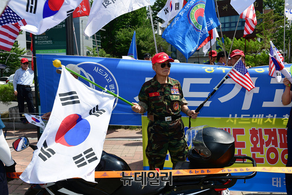 사드배치를 찬성하는 애국단체가 22일 오후 2시부터 경북 성주군 성주군청 앞에서 사드배치를 요구하는 현수막을 들고 이동하고 있다. 이날 집회는 전국 각지에서 배치를 찬성하는 참가자들이 태극기와 성조기를 들고 모였다. 집회 직후 군청 인근을 돌며 가두행진을 이어갔다.