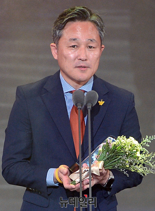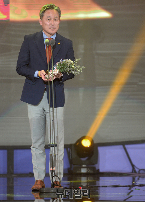 표창원 더불어민주당 의원이 23일 오후 서울 중구 장충체육관에서 열린 '맥심 케이 모델 어워즈(MAXIM K-MODEL AWARDS)'에서 댄스머신상 수상소감을 밝히고 있다.