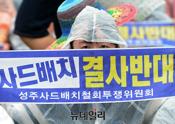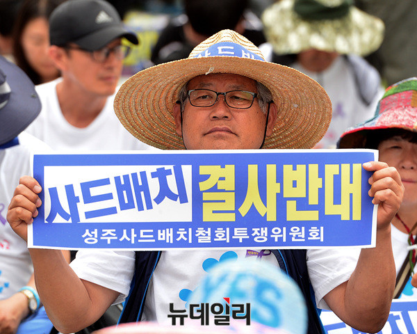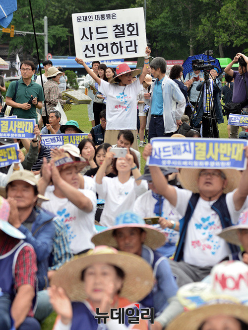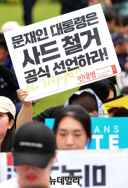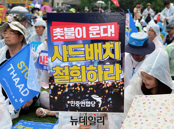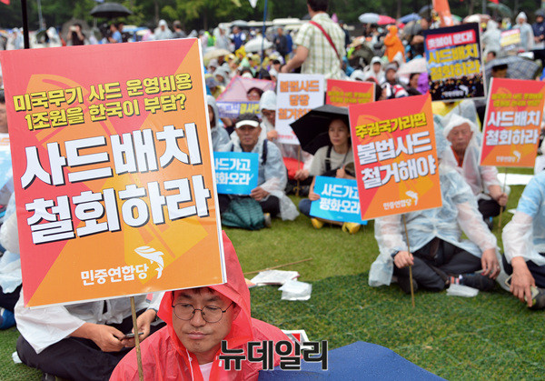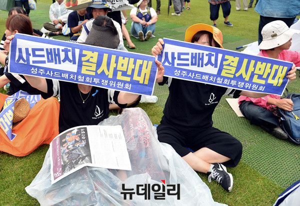 '6.24사드철회 국민평화행동' 집회에 참석한 시민들이 24일 오후 서울광장에서 '사드배치 결사반대'를 외치고 있다. 사드한국배치저지전국행동이 주최한 이날 집회에는 전교조(전국교직원노동조합), 민중연합당, 민노총(전국민주노동조합총연맹), 민중의꿈 등이 참석했다.