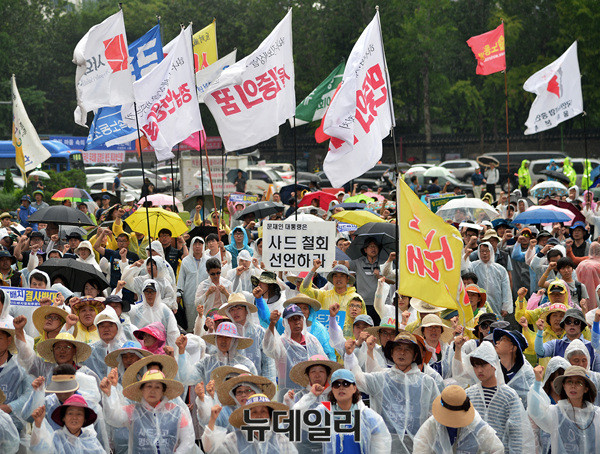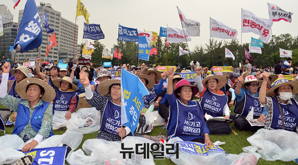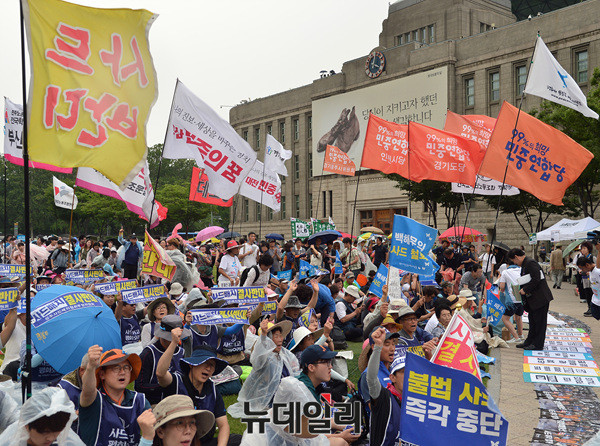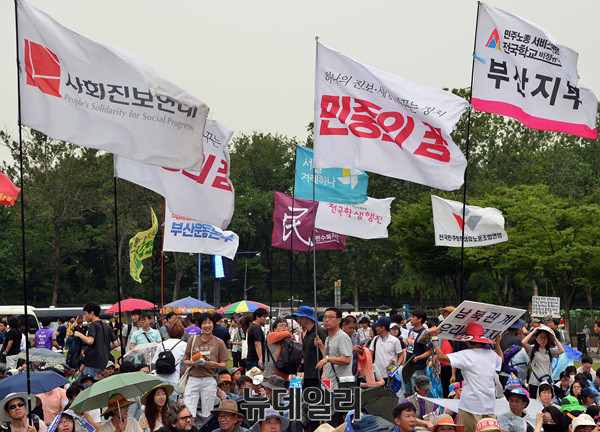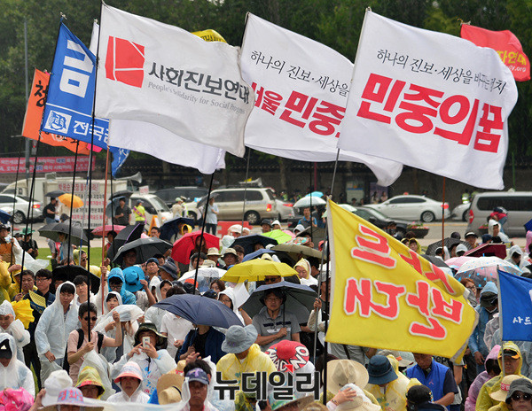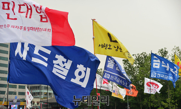 '6.24사드철회 국민평화행동' 집회가 열린 24일 오후 서울광장에 전교조(전국교직원노동조합), 민노총(전국민주노동조합총연맹), 민중의꿈 등 좌파단체 깃발들이 바람에 날리고 있다.