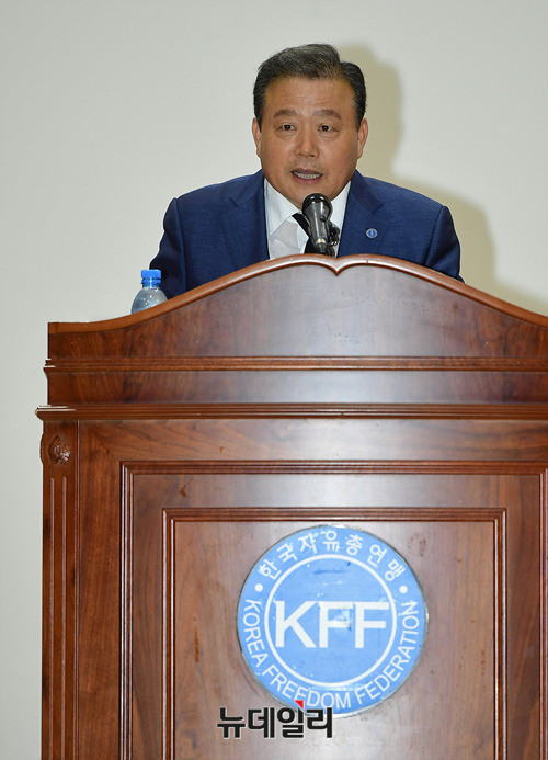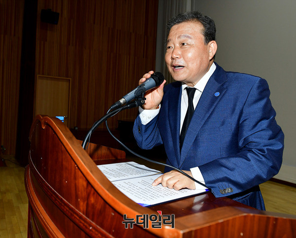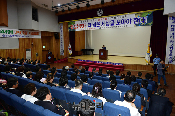 양재생 한국자유총연맹 부산시지부 회장이 25일 오후 부산 부산진구 한국자유총연맹 부산자유회관 대강당에서 열린 '통일선봉안보다짐결의대회'에서 대회사를 하고 있다. 이날 결의대회에는 유공회원에 대한 표창 수여와 통일선봉대로서의 결의를 다짐하는 시간으로 꾸며졌다.