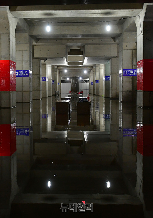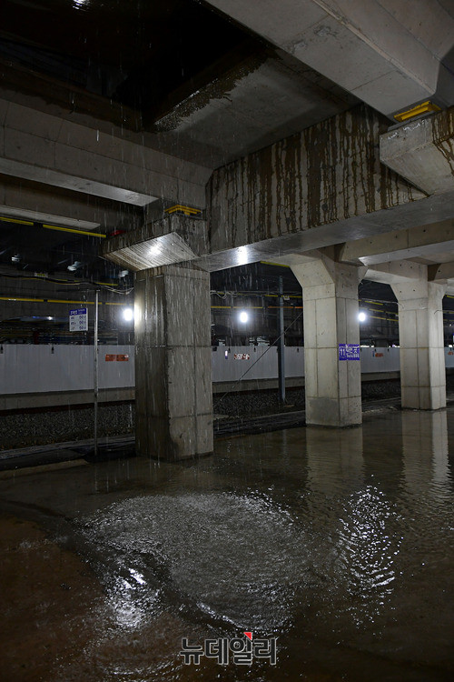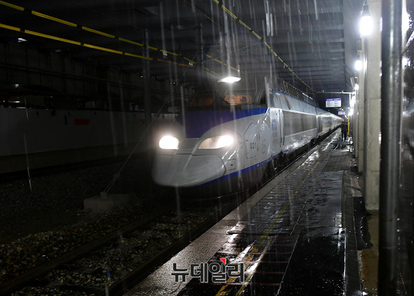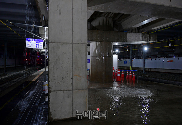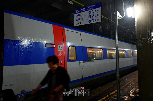 호우특보가 발효된 25일 오후 대구 동구 동대구역 플랫폼으로 열차가 들어오고 있다. 공사중인 동대구역 승하차 일부 구간은 많은 비로 일부가 침수돼 배수작업을 진행하고 있다.