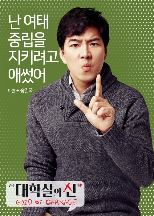 배우 송일국이 친절한 마초맨 '미셸'로 완벽 변신했다.송일국은 지난 24일 개막한 연극 '대학살의 신'에서 자수성가한 생활용품 도매상으로 아내를 실망시키지 않기 위해 노력하는 공처가이자 중립을 지키는 평화주의자 '미셸' 역을 맡아 열연을 펼쳤다.'대학살의 신'은 두 소년이 놀이터에서 싸우다 한 소년의 이빨 두 개가 부러지는 사고가 발생, 때린 소년의 부모인 알렝과 아네뜨가 맞은 소년의 부모인 미셸과 베로니끄의 집을 찾아오면서 시작되는 이야기다.자녀들의 문제를 원만하게 해결하기 위해 만났던 이들은 대화를 거듭할수록 유치찬란한 설전으로 바뀌고, 설전은 가해자 부부와 피해자 부부의 대립에서 엉뚱하게도 남편과 아내, 남자와 여자의 대립으로 이어지며 진흙탕 싸움으로 번진다.