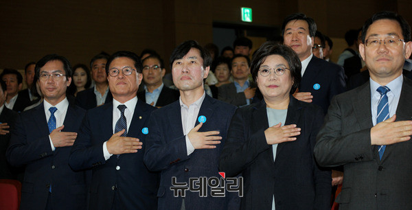 이혜훈 바른정당 신임 당대표가 26일 오후 국회 의원회관에서 열린 당원대표자회의에서 참석해 국민의례를 하고 있다. 이 신임 당대표는 당원투표와 여론조사 결과 16,809표(36.9%)를 차지했다. 이어 하태경 의원이 15,085표(33.1%), 정운천 의원이 8,011표(17.6%), 김영우 의원이 5,701표(12.5%)를 각각 차지했다.