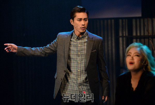 창작뮤지컬 '위대한캣츠비'에서 캣츠비의 동창 하운두 역을 맡은 배우 정태우가 27일 오후 서울 대학로 유니플렉스에서 열린 프레스콜에서 하이라이트 장면을 시연하고 있다.