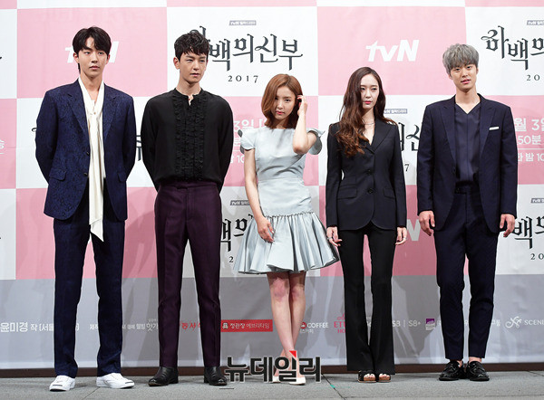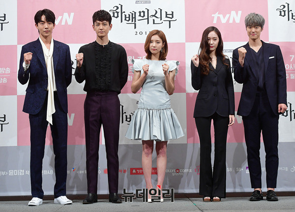 배우 남주혁, 임주환, 신세경, 정수정, 공명(왼쪽부터)이 27일 오후 서울 강남구 임피리얼팰리스 서울에서 열린 tvN 새 월화드라마 '하백의신부(연출 김병수, 극본 정윤정)' 제작발표회에 포토타임을 갖고 있다.