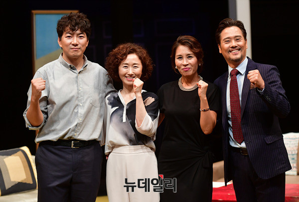 배우 송일국, 이지하, 최정원, 남경주(왼쪽부터)가 27일 오후 서울 서초구 예술의전당 자유소극장에서 열린 연극 '대학살의신' 프레스콜에서 포토타임을 갖고 있다. 6년 만에 새롭게 돌아온 '대학살의신'은 지식인의 허상을 유쾌하고 통렬하게 꼬집은 작품으로 프랑스 작가 야스미나 레자의 작품. 24일부터 7월 23일까지 예술의전당 자유소극장에서 공연된다.