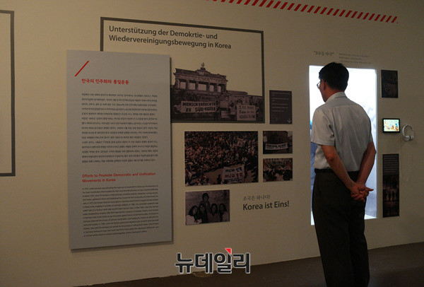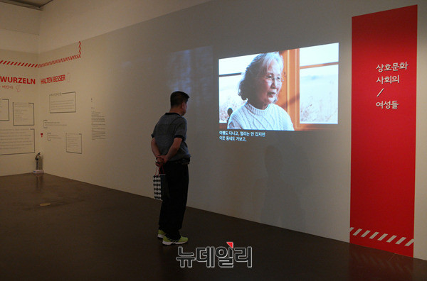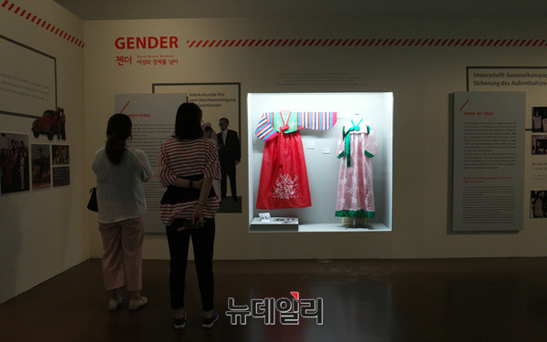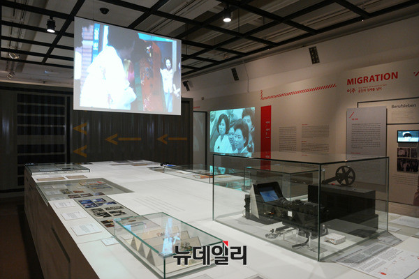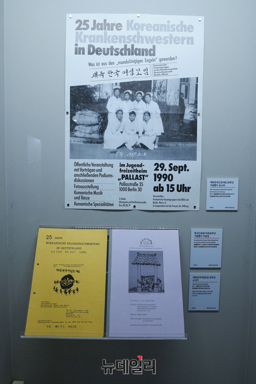 독일로 간 한국 간호 여성들의 삶을 담은 전시를 28일 오후 서울 종로구 서울역사박물관 전시실에서 관람객들이 구경하고 있다. 이번 전시는 27일부터 오는 9월 3일까지 '국경을 넘어, 경계를 넘어'를 주제로 독일 서베를린에서 활동한 한인 간호 여성들의 정치·문화적 삶을 집중적으로 조명한다.