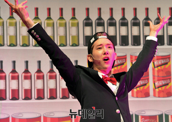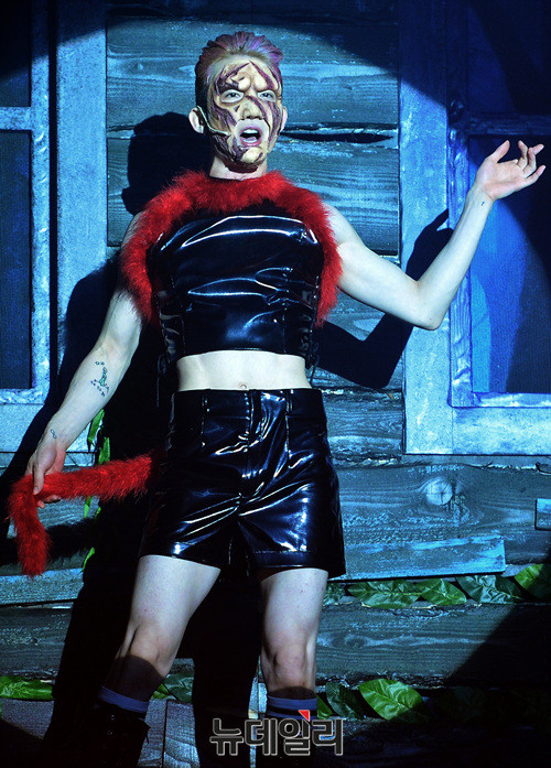 뮤지컬 '이블데드(Evil Dead)'에서 애쉬의 가장 친한 친구 스캇(SCOTT) 역을 맡은 그룹 2AM 조권이 28일 오후 서울 대학로 유니플렉스에서 열린 프레스콜에서 하이라이트 장면을 시연하고 있다.