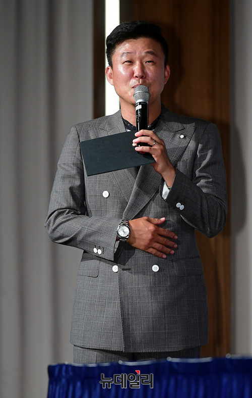 방송인 홍록기가 29일 오후 서울 서초구 더 리버사이드호텔에서 열린 클론 20주년 기념 앨범 'WE ARE(위아)' 쇼케이스에서 인사말을 하고 있다.