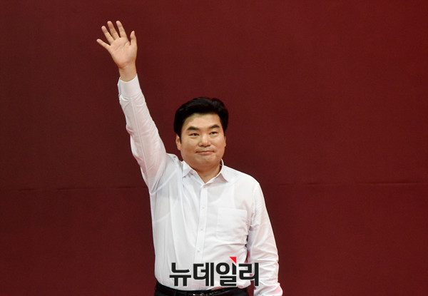 [포토] 지지자들에게 손들어 인사하는 원유철 당대표 후보