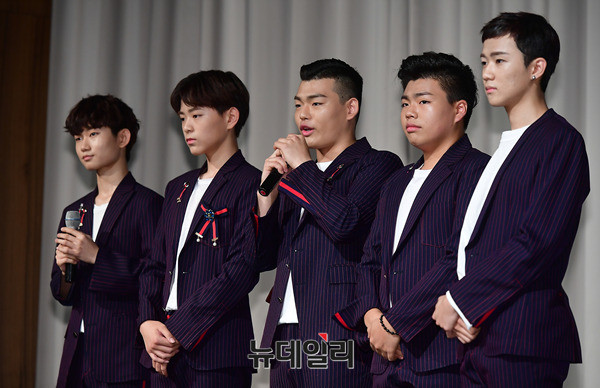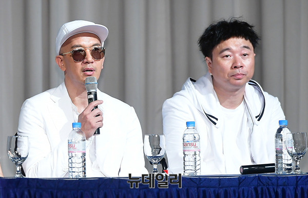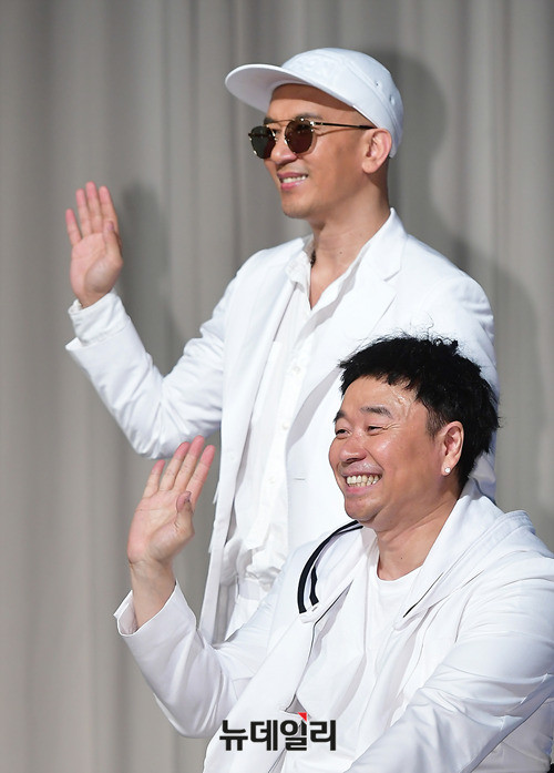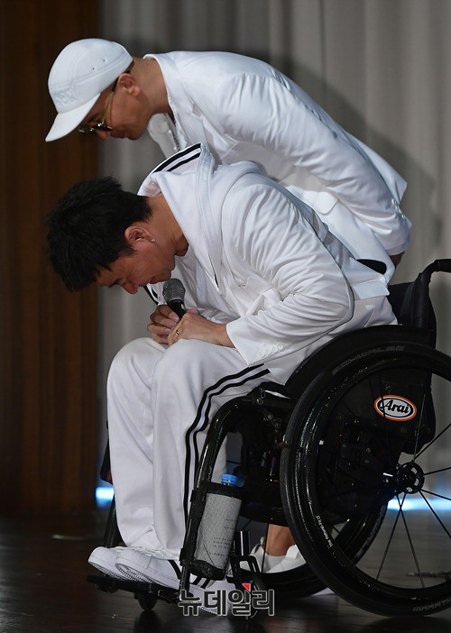 구준엽, 강원래(왼쪽부터)가 29일 오후 서울 서초구 더 리버사이드호텔에서 열린 클론 20주년 기념 앨범 'WE ARE(위아)' 쇼케이스에 앞서 후배들의 무대를 구경하고 있다.
