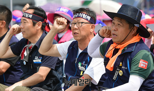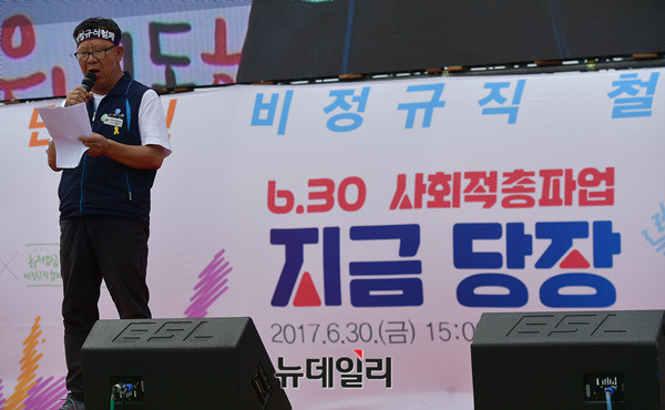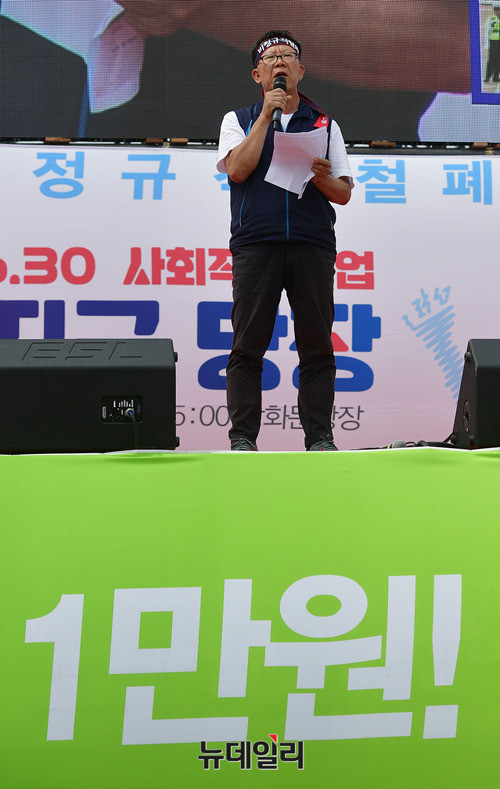 최종진 민주노총위원장 직무대행이 30일 오후 3시부터 광화문광장에서 '6.30 사회적 총파업'의 이름을 걸고 대규모 집회에 참석해 팔뚝질을 하고 있다. 민노총은 '최저임금 1만원', '비정규직 철폐', '노조권리'를 요구하며 총 파업을 대규모집회를 열었다. 민노총 측은 "이번 총파업은 비정규직이 주도하는 첫 민주노총 총파업"이라고 설명했다.