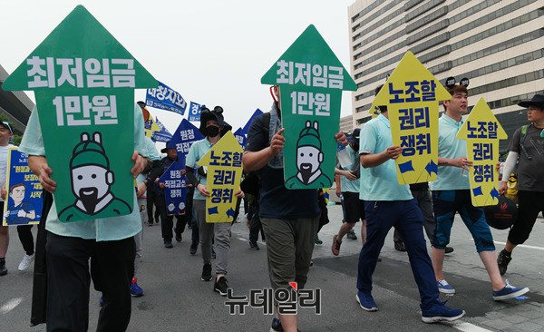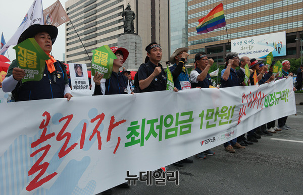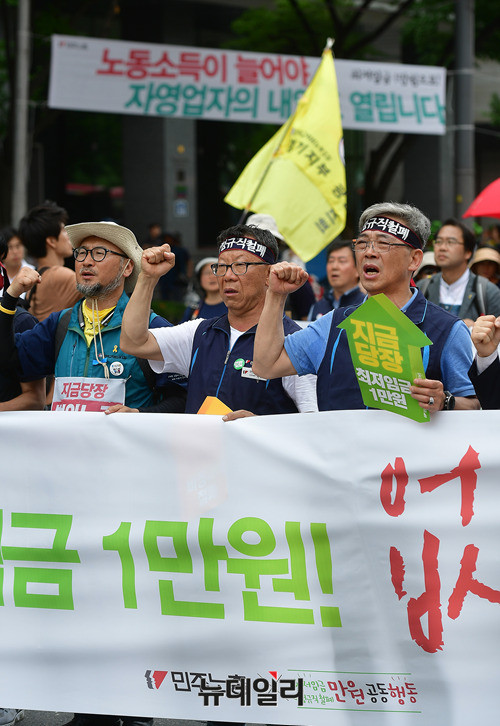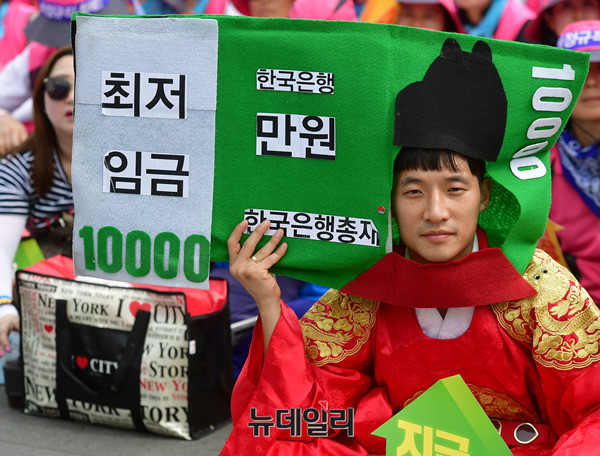 민노총 총파업 참가자가 30일 오후 3시부터 광화문광장에서 '6.30 사회적 총파업'의 이름을 걸고 열린 대규모 집회에서 최저임금 만원을 요구하는 피켓을 들고 있다. 민노총은 '최저임금 1만원', '비정규직 철폐', '노조권리'를 요구하며 총 파업을 대규모집회를 열었다. 민노총 측은 "이번 총파업은 비정규직이 주도하는 첫 민주노총 총파업"이라고 설명했다.