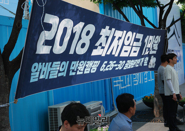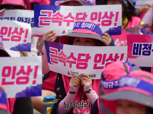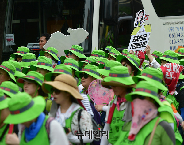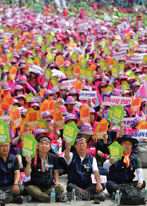 민노총이 30일 오후 3시부터 광화문광장에서 '6.30 사회적 총파업'의 이름을 걸고 진행중인 대규모 집회에서 "재벌곳간 열어서 지금당장 시급만원"이라고 적힌 현수막이 걸려있다. 민노총은 '최저임금 1만원', '비정규직 철폐', '노조권리'를 요구하며 총 파업을 대규모집회를 열었다. 민노총 측은 "이번 총파업은 비정규직이 주도하는 첫 민주노총 총파업"이라고 설명했다.