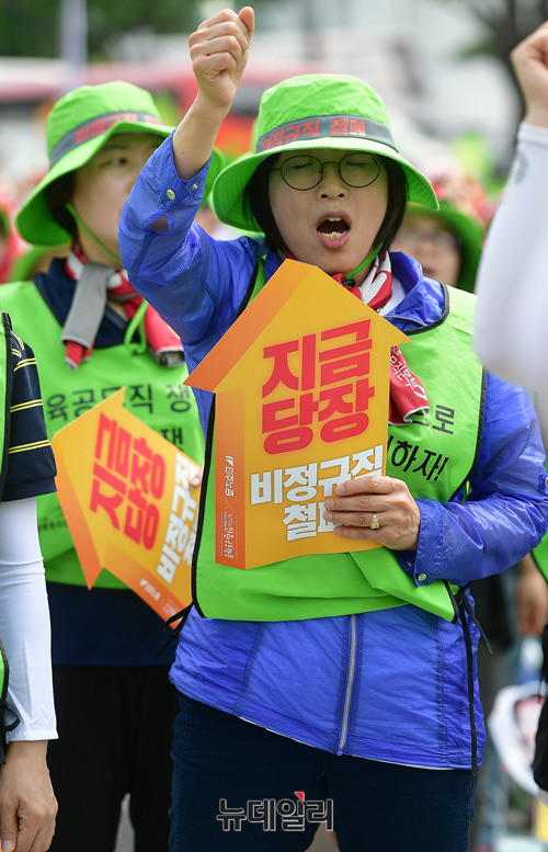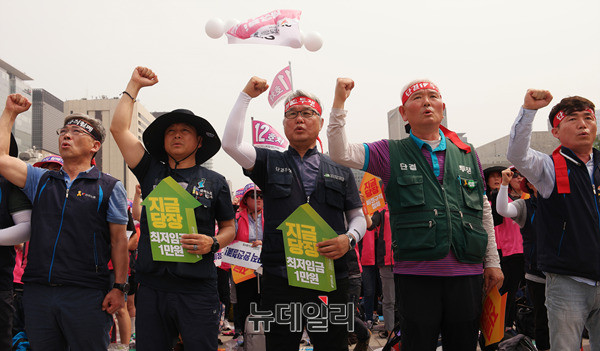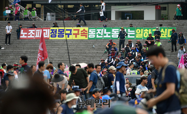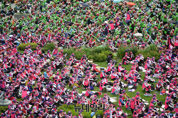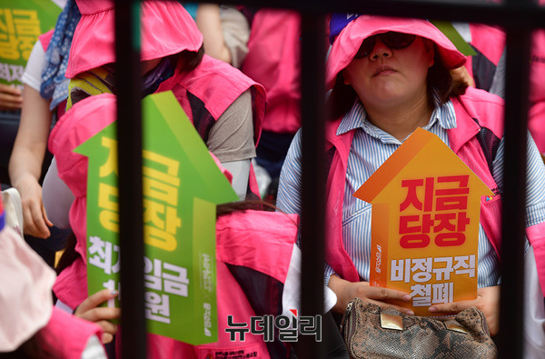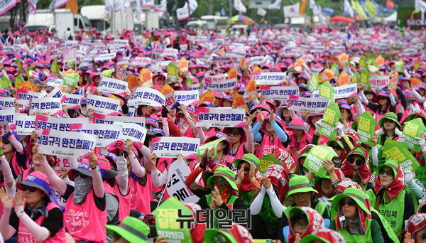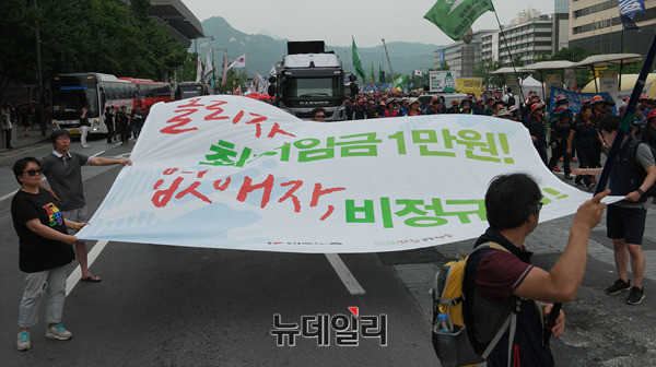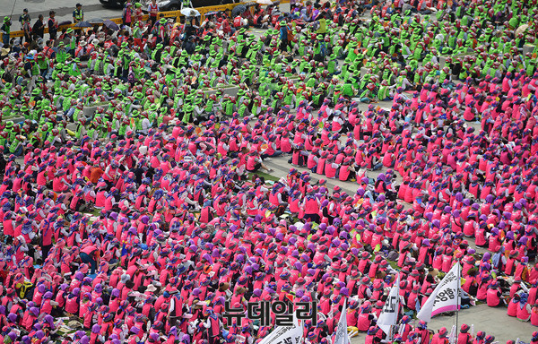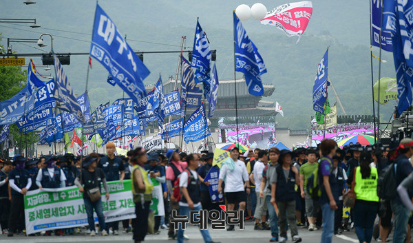민노총이 30일 오후 3시부터 광화문광장에서 '6.30 사회적 총파업'의 이름을 걸고 열린 대규모 집회에서 열고 있다. 이날 민노총은 '최저임금 1만원', '비정규직 철폐', '노조권리'를 요구하며 총 파업을 대규모 집회를 열었다. 민노총 측은 "이번 총파업은 비정규직이 주도하는 첫 민주노총 총파업"이라고 설명했다.