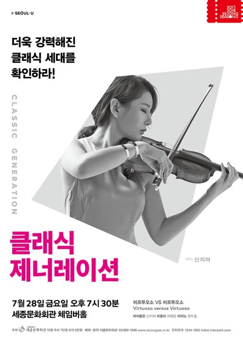두 클래식 여제, 바이올리니스트 신지아(30)와 비올리스트 이화윤(21)이 -활 끝으로 맞선다.7월 28일 오후 7시 30분 세종문화회관 체임버홀에서 '비르투오소vs비르투오소'를 주제로 화려하고 강렬한 연주력의 바이올리니스트 신지아와 파워풀한 비올리스트 이화윤이 한 무대에 오른다.세종문화회관(사장 이승엽)은 세계에서 활약하고 있는 한국의 젊은 음악가들과 클래식 관객층을 위한 기획 공연 '클래식 제너레이션(Classic Generation)'을 올해 4차례 선보인다. 앞서 지난 3월 17일 더블베이시스트 성민제와 함께 전석 매진의 오프닝 무대를 성공적으로 마친 바 있다.신지아는 2008년 세계적인 권위를 자랑하는 프랑스 롱-티보 국제 콩쿠르에서 1위를 차지했으며, 오늘날 국내 '클래식 세대'를 이룬 1등 공신이다. 이화윤은 한국인 최초로 유리 바쉬메트 콩쿠르에서 우승, 안네-소피 무터 재단의 후원을 받으며 세계를 무대로 활동하고 있다.두 명의 클래식 여제는 각각 '비탈리 - 샤콘느 g단조', '이자이 - 솔로 소나타 3번'을 연주한다. 이어 '프로코피예프 - 두 대의 바이올린을 위한 소나타'를 바이올린, 비올라로 연주하며 고도의 기교 대결을 펼친다. 또, 2014 뮌헨 ARD콩쿠르 1위 없는 2위를 거머쥔 피아니스트 한지호가 가세해 '라벨의 피아노 트리오 a단조'를 들려준다.클래식 제너레이션 '비르투오소 vs 비르투오소'는 세종문화티켓과 인터파크에서 예매할 수 있다. 관람료 5만~7만원. 문의 02-399-1000.[사진=세종문화회관]