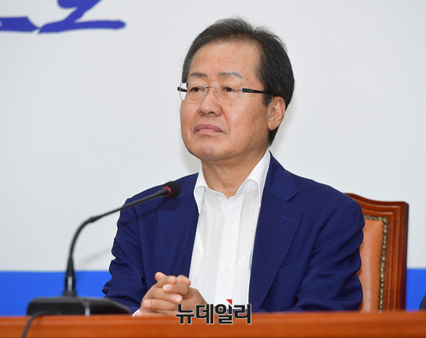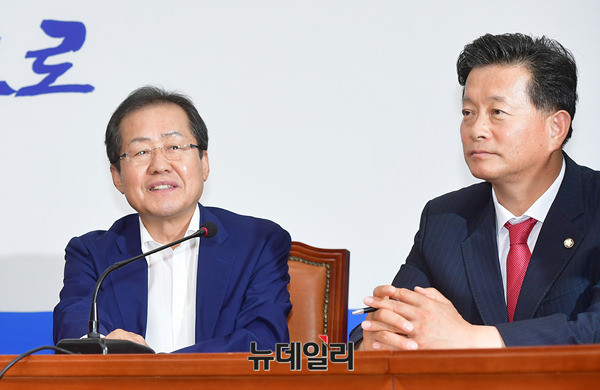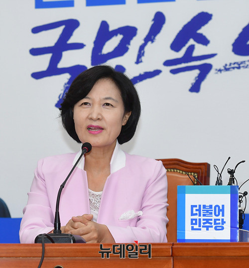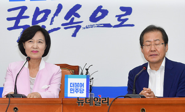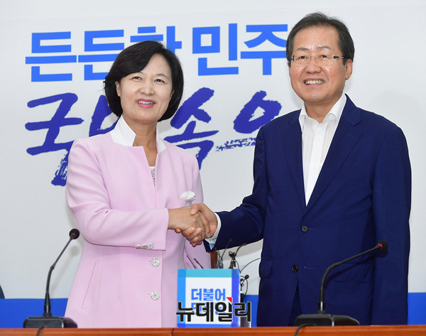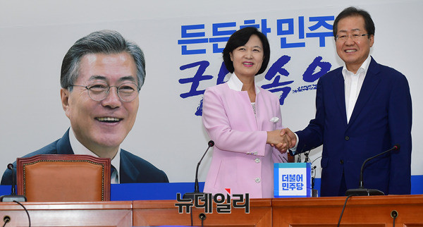 홍준표 자유한국당 신임 대표가 4일 오후 국회 더불어민주당 대표실을 찾아 추미애 당 대표를 예방하고 있다. 이날 예방은 모두발언 직후 비공개 회담 없이 마무리됐다. 앞서 홍 대표는 자유한국당 대표실에서 전병헌 청와대 정무수석과 면담을 했다.